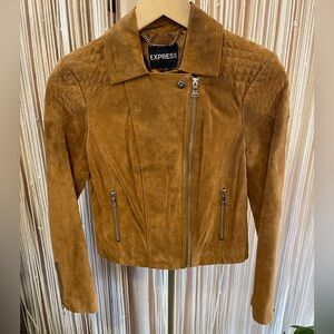 A stylish women's suede moto jacket from Express featuring a classic tan color and zippered pockets. The jacket is made from genuine leather with a polyester lining, offering both comfort and durability. This pre-loved suede moto jacket does have a mark to the back, noted in photos. Marked size xs.