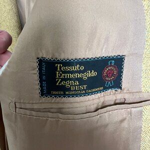 Step up your style game with this luxurious vintage Ermenegildo Zegna cashmere blazer. Woven in Italy from a sumptuously soft Mongolian cashmere, this blazer is a timeless staple that offers unparalleled comfort and quality. It features a relaxed oversized fit, traditional notch lapels, and practical front pockets. The versatile camel tan yellow hue makes it the perfect neutral layering piece for both professional settings and elevated casual wear. This is a rare, gem that embodies Italian luxury and is sure to become a cherished piece in any discerning wardrobe.