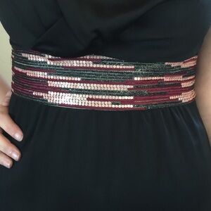 Elegant black dress with multicolor waistband. Features intricate hem design. Perfect for evening wear.