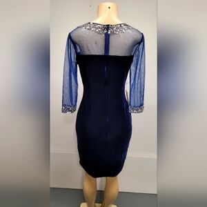 This beautiful dress is a blue soft velvet fabric with sheer bodice and sleeves. It features silver sequins and gems. Fully lined. Fully padded bra. Ruched on on side.
