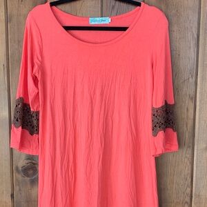 Chic coral fringed oversized tee dress by Southern Grace. Soft fabric. Ideal for casual wear. Excellent used condition. Women’s size small with loose fit design. Armpit to armpit measures 18 inches. Length from top of shoulder to bottom measures 38 inches.