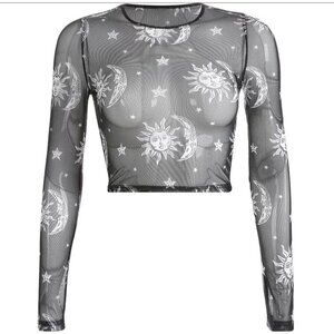 A sheer black mesh crop top designed w/ white sun, moon & star motifs for a striking celestial look.