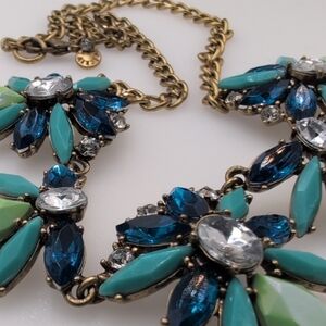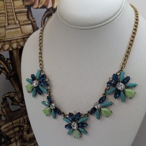This exquisite J. Crew necklace showcases a captivating blend of blue and green floral-inspired clusters, elegantly suspended from a gold-toned chain. The faceted blue elements sparkle brilliantly, while the translucent green accents add a touch of natural beauty. Perfect for making a statement, this necklace is a must-have accessory for any jewelry collection.