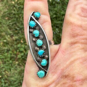 This 1930s Zuni ring is crafted in sterling silver and set with petit point turquoise stones arranged in an elongated vertical design. The slim profile and early stonework reflect Zuni jewelry from the early Southwestern period, with hand-fabricated silver elements and closely set stones typical of the era.