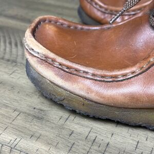 Clarks Wallabees men's chukka boots in rich brown leather. These iconic shoes feature a classic moccasin construction and comfortable crepe sole. Perfect for casual outings or adding a touch of timeless style to your everyday look. These have been well loved. There is wear at the toes where the leather is rubbed surface scratching in the leather. Wear to the soles. Size 7M