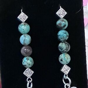 These elegant earrings feature beautiful green turquoise beads paired with intricate silver heart designs. Perfect for adding a touch of sophistication to any outfit. Great Valentines gift or for any occasion