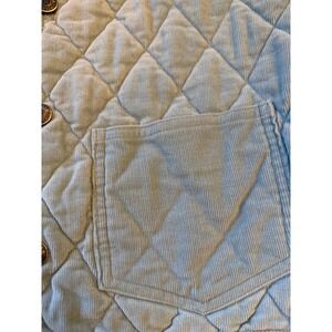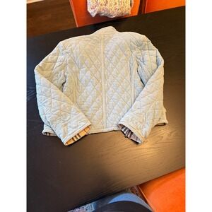 Burberry quilted jacket in a light pastel hue. A classic heritage check lines the interior, offering a subtle nod to the brand's iconic patterns. Features a button-front closure and two front pockets.