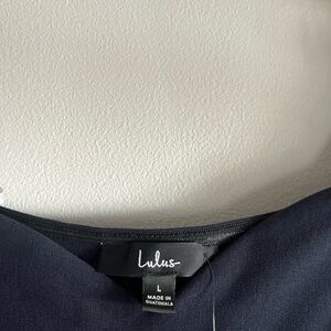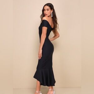 New with tags. This elegant Lulus off-the-shoulder midi dress is crafted from a structured yet stretchy ponte knit that smooths and supports while remaining comfortable. The sweetheart neckline and fitted bodice create a flattering silhouette, flowing into a trumpet-style skirt with a subtle high-low ruffle hem. A timeless midnight blue shade that’s perfect for weddings, cocktail events, date nights, and formal occasions.