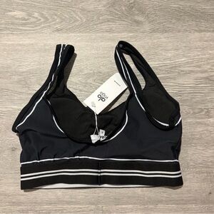 Alo sports bra and leggings set in black with white trim. Stylish and comfortable for workouts.
