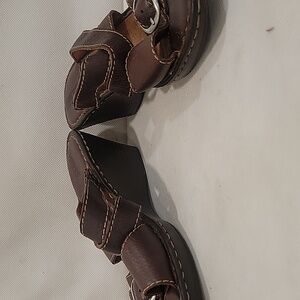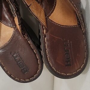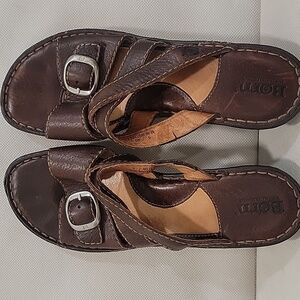 Born brown leather 2-1/2" heel sandals (sz 9). There are a few small marks on the right heel. Please see all pictures.