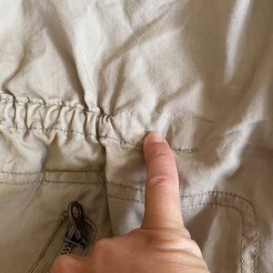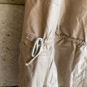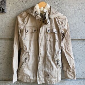 Very gently worn and very clean utility jacket with faux fur (soft mink blanket style/jersey) removable vest inside. Vest has soft gray jersey on one side and super soft cream faux fur on the other side. I am fairly certain this is a size small in Hurley because I bought it in my more petite days but I can’t find a size tag on it so please refer to the measurements below and don’t hesitate to ask if you need others. Condition notes- very clean and lightly worn but please see picture #6 (pointing at a subtle mark on the inside white vest & picture #13 a 1.5” of stitching missing on the drawstring part. Lay flat measurements: Pit to pit 18” Length down front zipper- 27” Waist- 17” Hips 20” Sleeve from shoulder seam to cuff 25” Feel free to send questions before purchasing. Happy to help.