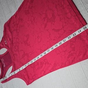 This high-performance athletic top features a beautiful hot pink color with a subtle, tonal abstract/cloud-like print throughout. Designed for the active woman, the racerback silhouette allows for a full range of motion during lifting, running, or yoga, while the scoop neckline provides a classic, flattering fit.