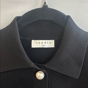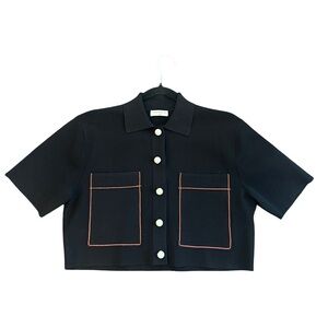 Gorgeous Sandro Paris Elan black very fine knit crop pearl button front sweater large pockets with orange trim but not a bright orange gorgeous classic piece size 1 size 4 US,