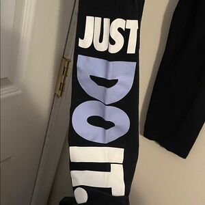 Comfortable black leggings with white Nike branding. Perfect for workouts.