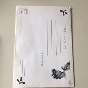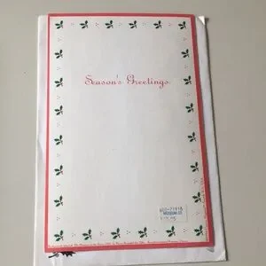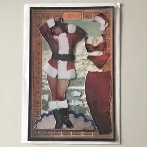 Venus Christmas card and envelope magnet set with red and white outfit pieces. Includes assorted change of clothes Santa hat, jacket, pants, and boots and undies!