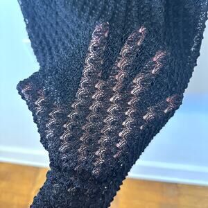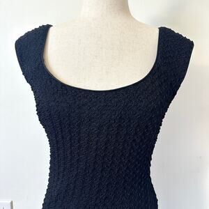 Keywords: Niki Livas, vintage black dress, bodycon midi dress, textured knit dress, made in USA dress, union made, sleeveless evening dress, cocktail dress, date night, little black dress