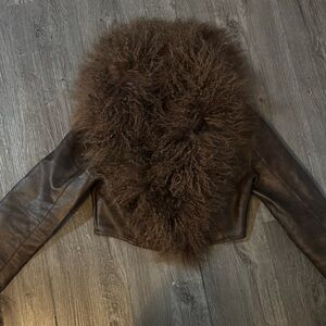 Mongolian fur trims on the collar and cutts, and a front zip closure, this exclusive collab blends edge and elegance effortlessly.