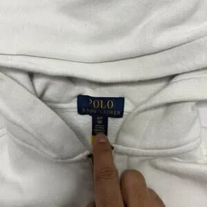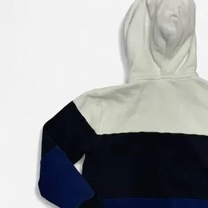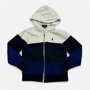 Polo Ralph Lauren kids zip-up hoodie featuring a clean colorblock design in white, navy, and blue with embroidered Polo logo on the chest. Full zip front with attached hood, soft fleece interior, and ribbed cuffs and hem for a comfortable fit. Size 8. Check photo 5 for a small stain on the back shoulder. A timeless Ralph Lauren piece that’s perfect for everyday wear. All pictures and measurements are provided—please review them carefully before purchasing. This item is sold as-is, with no refunds or returns. Feel free to ask any questions before buying.