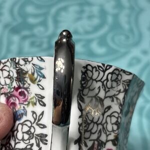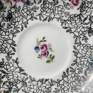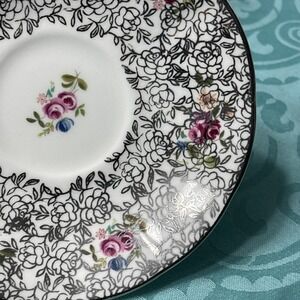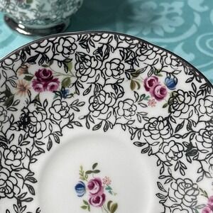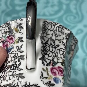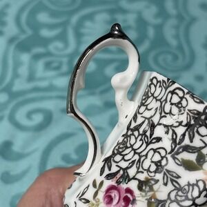 This vintage Elizabethan Fine Bone China Teacup & Saucer set from England features a floral pattern in a multicolor design, perfect for serving hot or cold beverages. The round-shaped set includes an embossed and painted tea cup with a handle, suitable for decorative display. Made of bone china, this 1950s style set is handmade in the United Kingdom and exudes an artful theme. Ideal for collectors or those looking to add a touch of elegance to their kitchen or dining area.