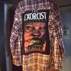 upcycled bleached flannel shirt w/ custom EXORCIST MOVIE back patch