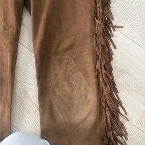 Stylish boot cut pants with fringe detail. Rich brown color. Perfect for a bold western look! Fits like a 26” pair of pants.