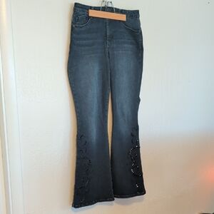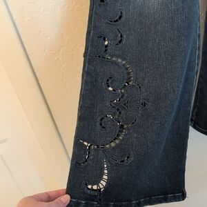Vintage vibes dark wash, flare-leg jeans featuring unique, ornate cutouts (die cut) on the flare. Bohemian, BOHO, retro, vintage-inspired.
