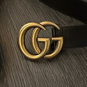 Elegant Gucci belt with iconic gold GG buckle. Sleek black leather design. Perfect for any outfit.