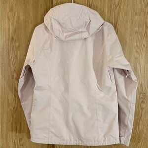 Light pink rain resistant jacket with hood. Features front zipper and side pockets. Ideal for winter sports.