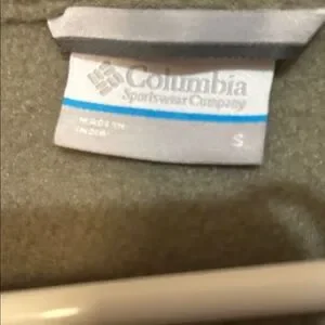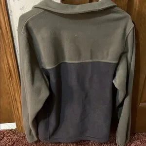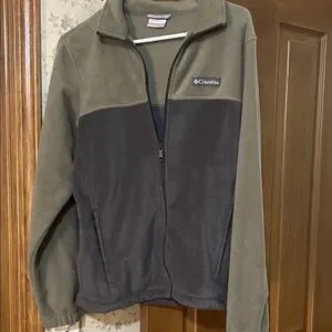 Women’s Cozy Columbia fleece with zip-up front. Olive and charcoal color scheme. Perfect for outdoor adventures. Size small