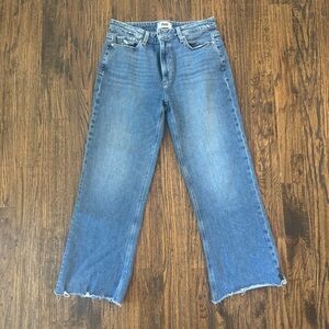 PAIGE Leenah Ankle jeans raw hem wide leg jeans size 29. Excellent condition. Retails for $248. Fabric is mid-weight, low-stretch denim - 98% cotton, 2% elastane. Fading and whiskering, Light distressing and raw hem with 5-pocket styling.