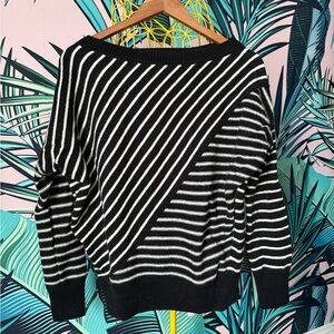 Black and white ALLSAINTS boatneck sweater with asymmetrical striped print.