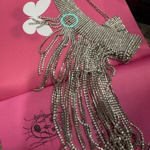 Dazzling silver rhinestone necklace with fringe design. Perfect for adding sparkle to any outfit.there is one tiny rhinestone missing from band choker- it is circles in teal in second photo.