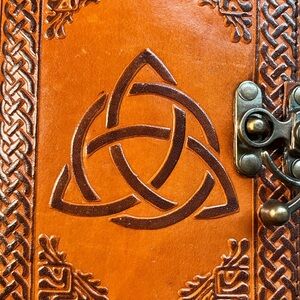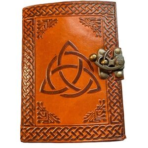 Set of two embossed leather journals. Features intricate Celtic designs. Secure brass clasps. Handmade paper. Two colors, tan with white paper and dark brown with antique paper. Record travels, sketches and dreams, or give as a gift! Size 5” x 7” x 1”
