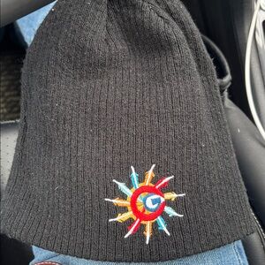 Coogi Australia knit beanie in black with a distinctive colorful embroidered logo. The logo design resembles fireworks or a burst of color, a unique variation of Coogi's signature kaleidoscopic patterns.