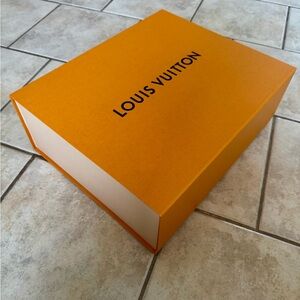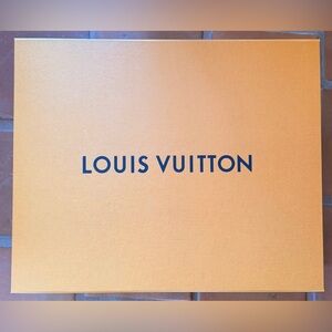 Elegant Louis Vuitton storage box and bag. Perfect for organizing. Stylish and functional. Length = 14.5 in.; width = 18 in.; depth = 6.5 in. Box and paper bag.
