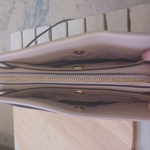MICHAEL KORS JET SET LEATHER CROSSBODY BAG IN BLUSH TAUPE. ADJUSTABLE CROSSBODY STRAP WITH GOLD CJAON ACCENT. LARGE ZIP INTERIOR WITH 2 SIDE MAGNETIC SNAP CLOSURES AS WELL AS 2 LARGE SIDE POCKETS. PLEASE NOTE BOTTOM HAS MINOR RUBBING.