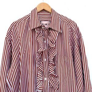 Chic Plan C shirt dress crafted in structured Italian cotton with timeless striped detailing. The ruffled front and classic collar give this piece a refined yet playful feel, blending modern preppy style with effortless European ease.