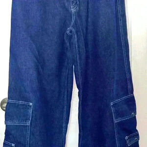 Ultra wide, 13” across the bottom with a 31” inseam these are super ultra wide skaters jeans. Size 32, side cargo pockets dark denim.