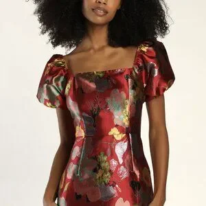 You'll leave 'em mesmerized when you show up in the Lulus So Stunning Red Multi Floral Jacquard Puff Sleeve Mini Dress! Medium-weight jacquard fabric, with a colorful floral design and metallic lurex threading, shapes this glam dress that has a square neckline and puffy short sleeves with elastic at the shoulders and cuffs. A princess-seamed bodice tops an A-line mini skirt to complete the look. No-slip strips. Hidden back zipper/clasp.