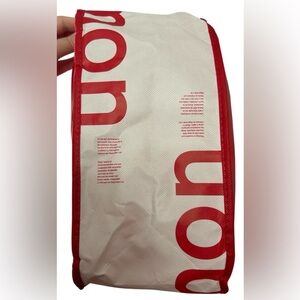 Bold red and white reuseable tote from Lululemon. Ideal for daily essentials. Lightweight and stylish.
