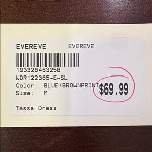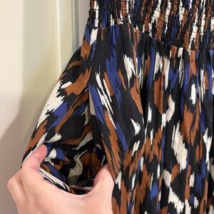NWT. Elevate your everyday dress collection with the Tessa Dress by EVEREVE, featuring a smocked bodice, square neckline, side pockets, and a tiered skirt with smock details. Pair with statement sandals and your favorite clutch to elevate this look. Blue/Brown Abstract Print, EVEREVE Exclusive, Square Neckline. Measures 40 1/4” Center Front Length. Material: Self: 92% Lyocell, 8% Linen; Lining: 100% Rayon Exclusive of Elastic.