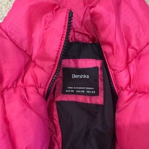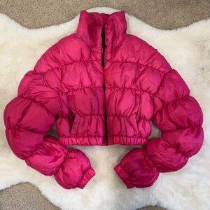 Bold hot pink puffer jacket. Cozy and fashionable. Wear out over you ski apron for a cropped jacket look. Put it on your tween!