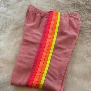 Comfortable and stylish pink sweatpants for kids featuring a vibrant neon stripes on side. Light wear.