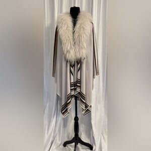 Stunning Double D Ranch sleeveless knit poncho/vest featuring a luxe ivory faux fur collar and signature Southwestern geometric design. This statement layering piece has an elegant draped silhouette with an open front, making it perfect over denim, boots, or a simple dress.