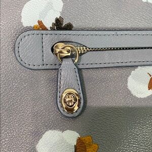 Features: Coach, blue, light blue, cornflower blue, high-quality leather, soft leather, floral design, front zipper area with lock, fabric crossbody strap, black interior, interior pockets, zip closure, smooth zipper, gold hardware, purse organization, organized, travel friendly, cute, stylish, elegant, fun, chic, colorful