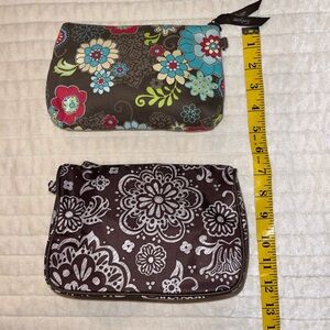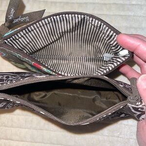 The large cosmetic bag is conveniently lined with wipeable plastic. This bag has been used but is in great shape.
