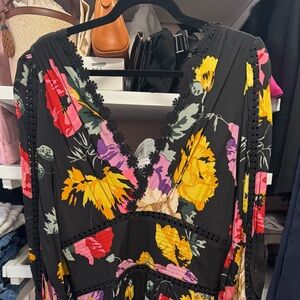 Like new - elegant black dress with vibrant floral patterns. Features a V-neckline and lace trim. Worn once.