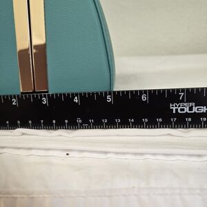 This stylish teal handbag features elegant gold accents, perfect for any occasion. Its sleek design and vibrant color make it a must-have accessory.