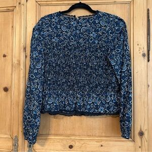 Chic and feminine navy smocked top with floral pattern. Crochet detail around collar and hemline. Like new. Excellent condition