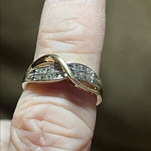 This stunning two-tone infinity ring features a blend of 10k gold, and adorned with sparkling accents. A perfect choice for adding elegance to any ensemble.